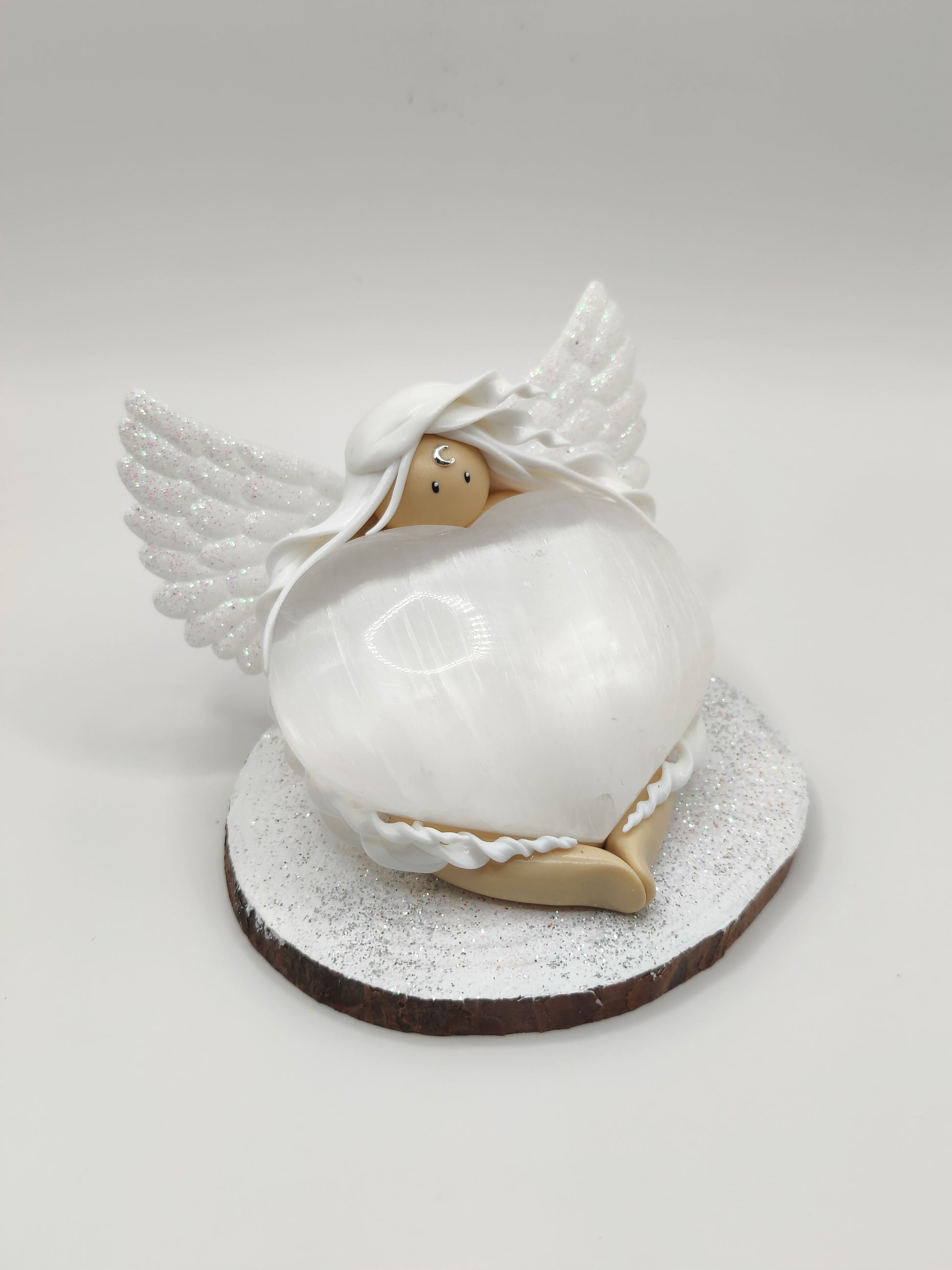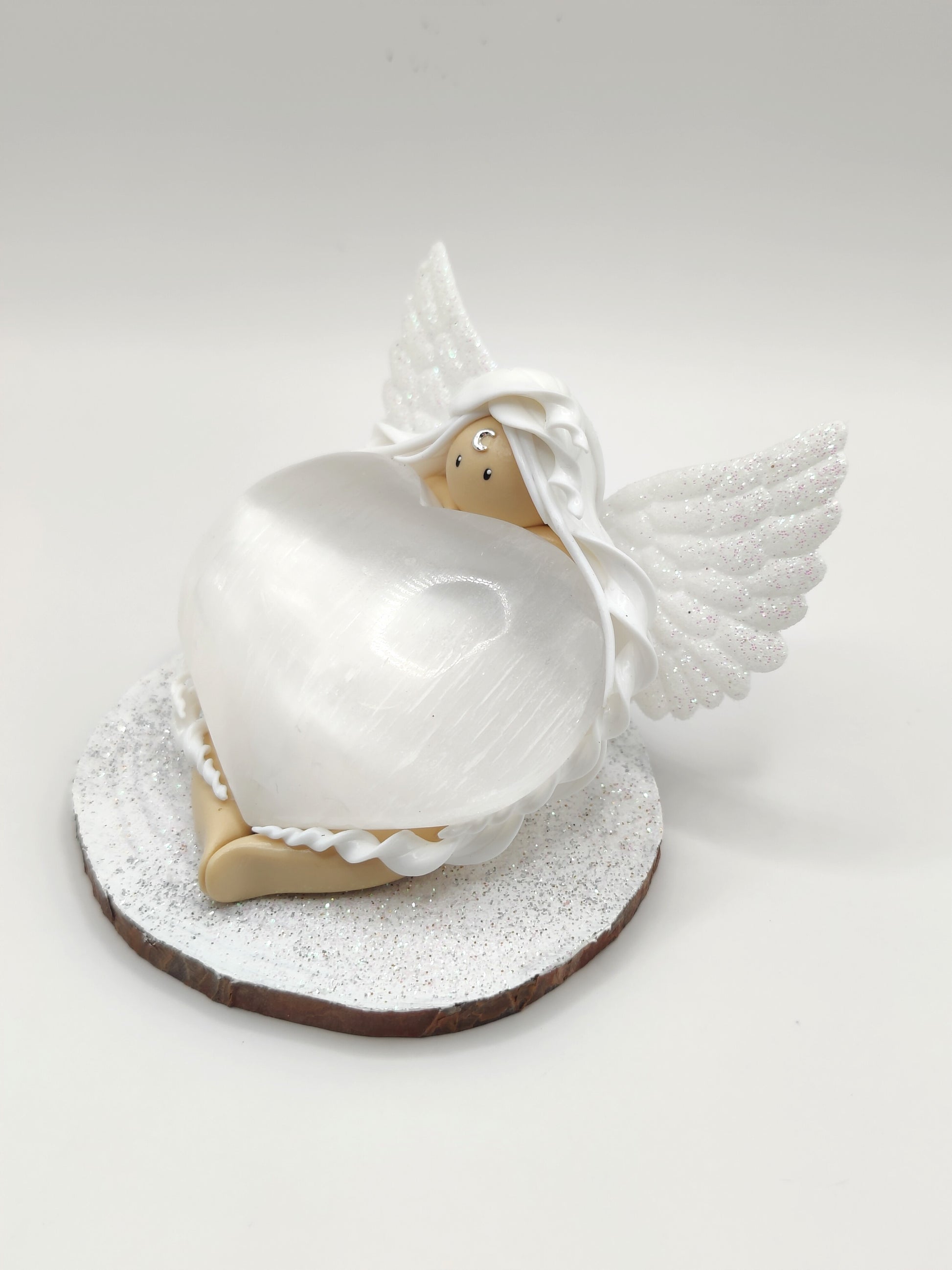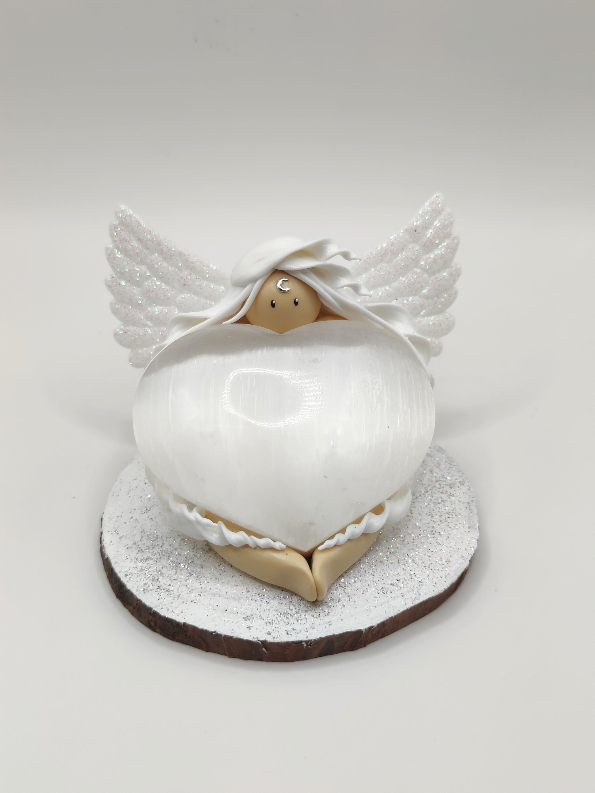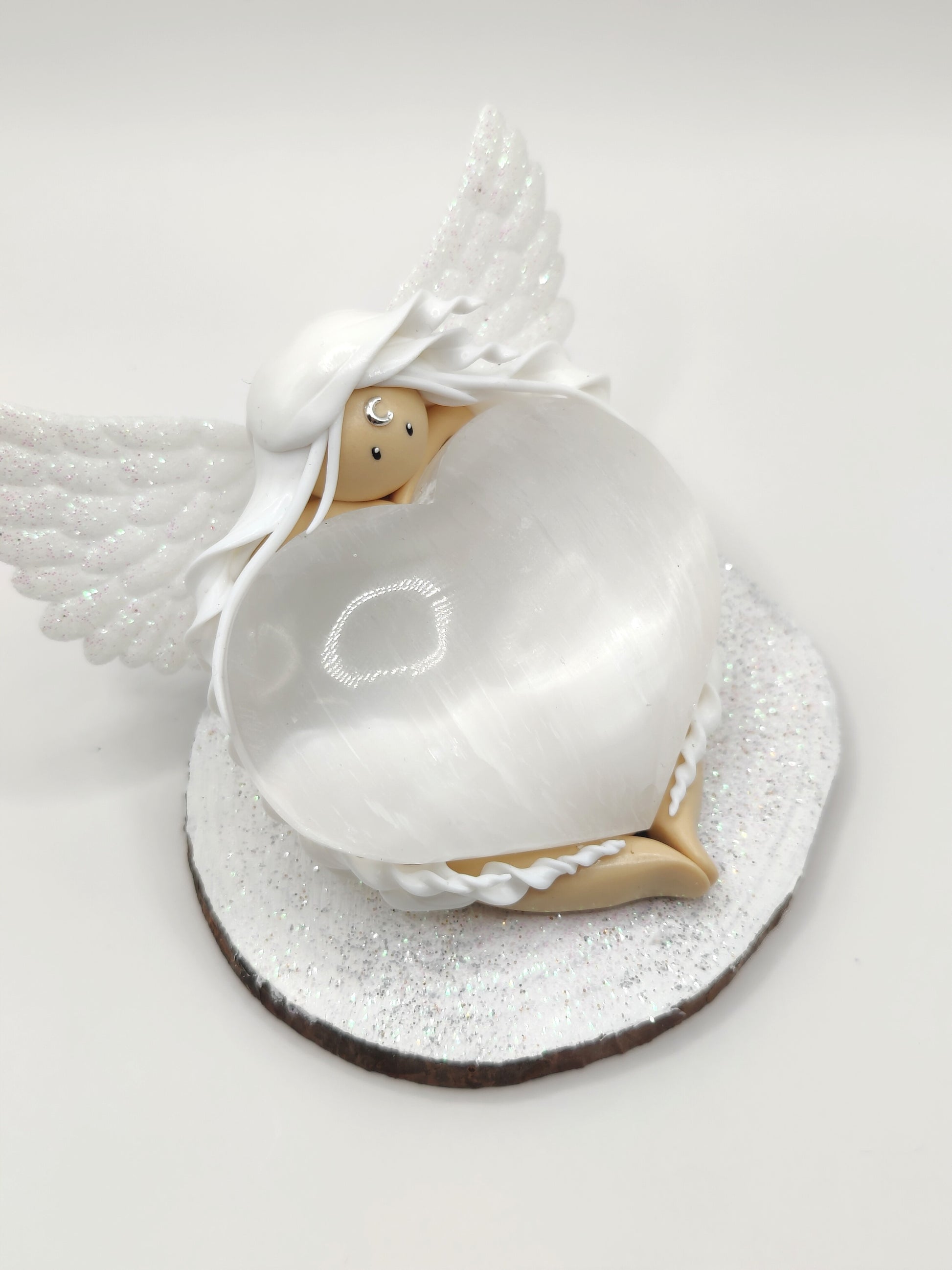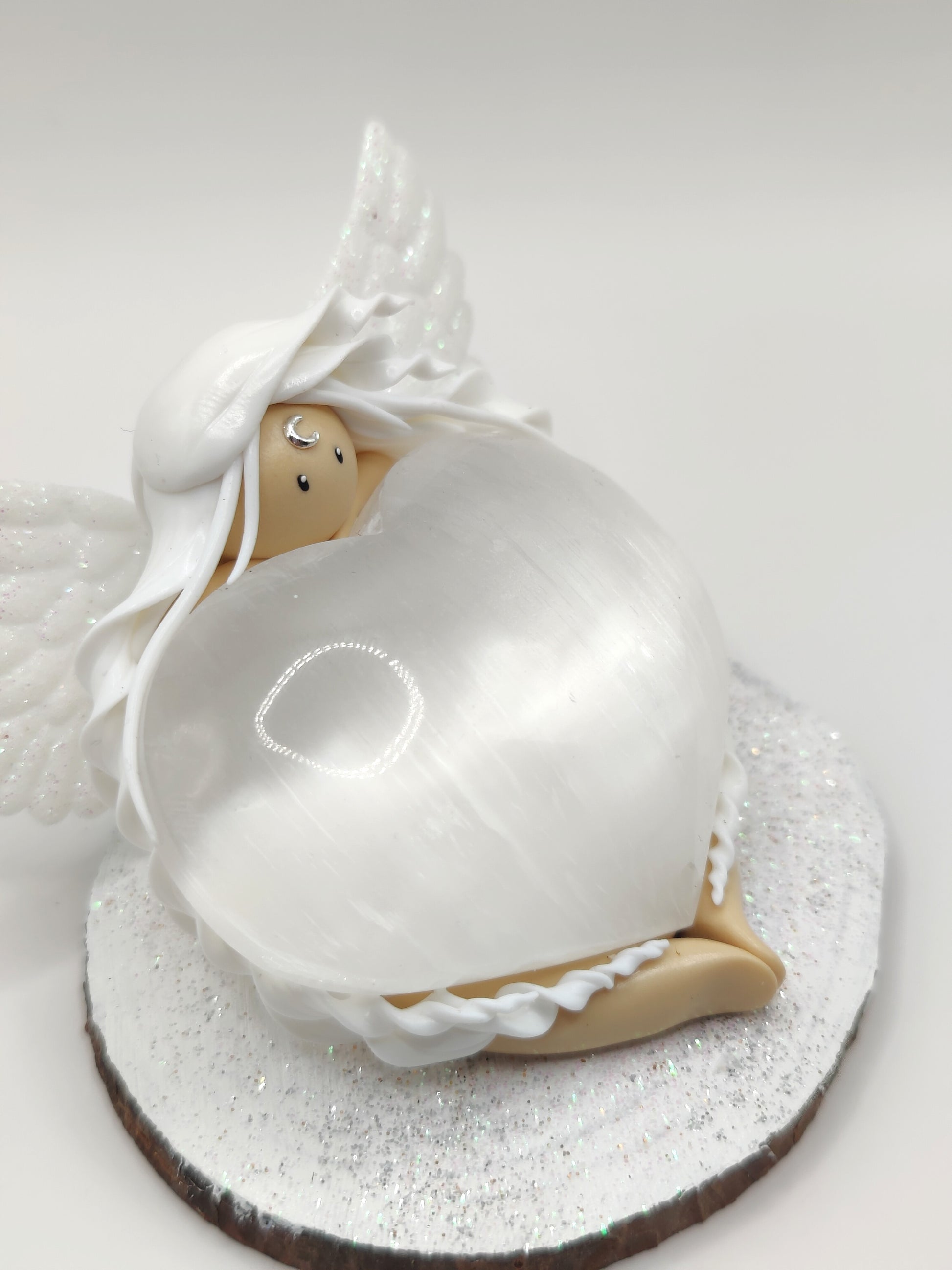 Jolie ange blanche et sa magnifique sélénite en forme de cœur. Une Linotte douce et apaisante.