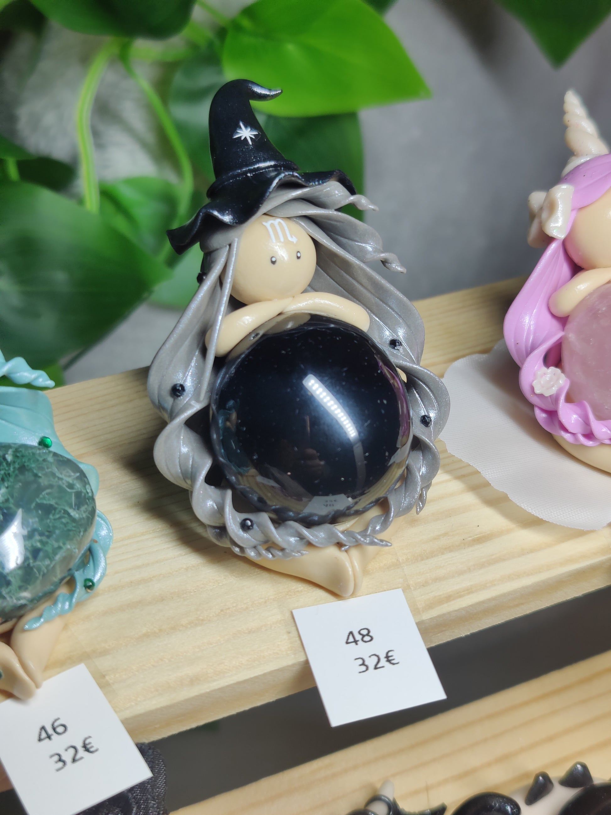 48 : 32€ : Sorcière du signe scorpion et son obsidienne noire . Une linotte protectrice.