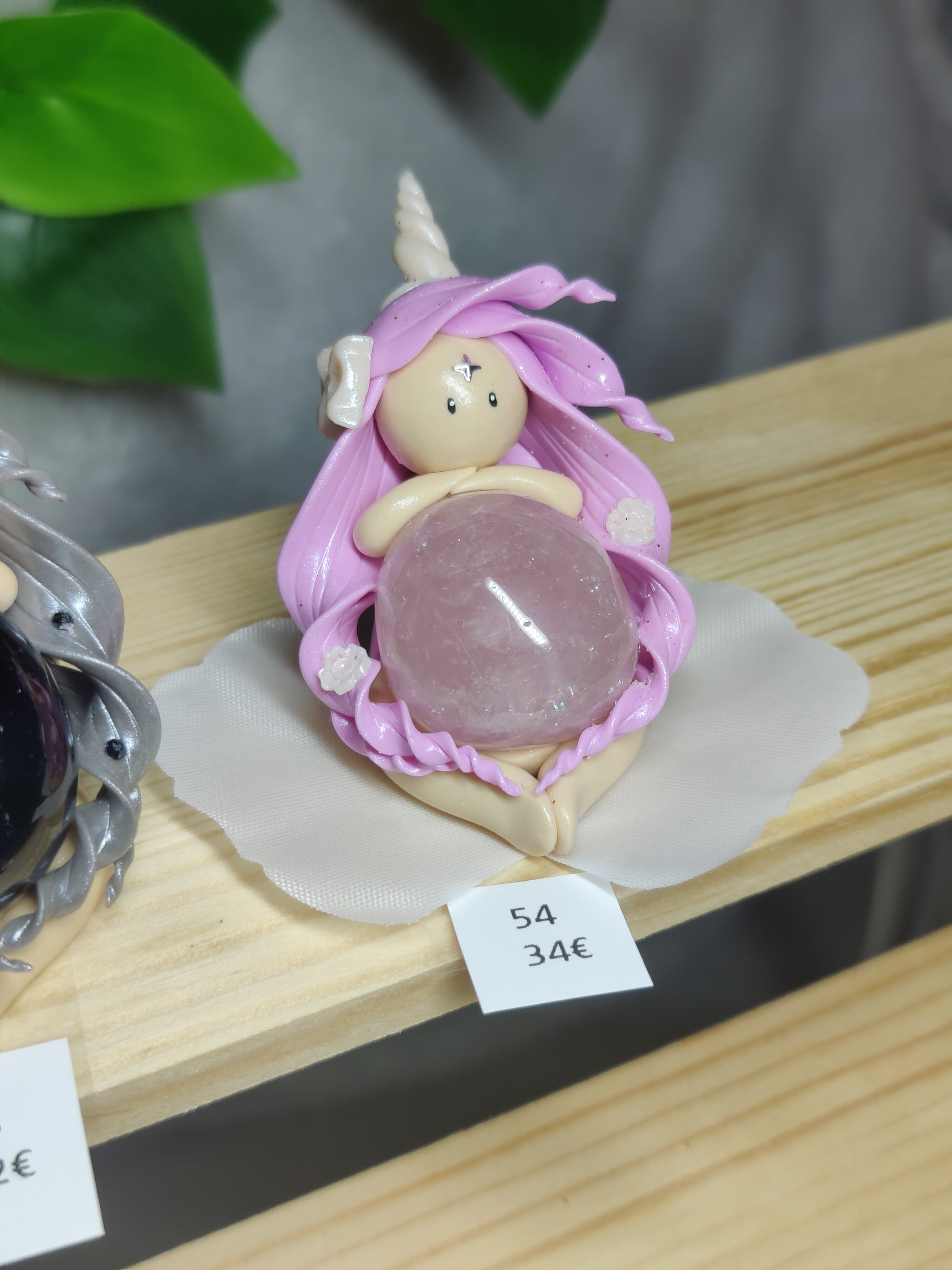 54 : 34€ : Licorne et son quartz rose. Une linotte bienveillante et rêveuse.
