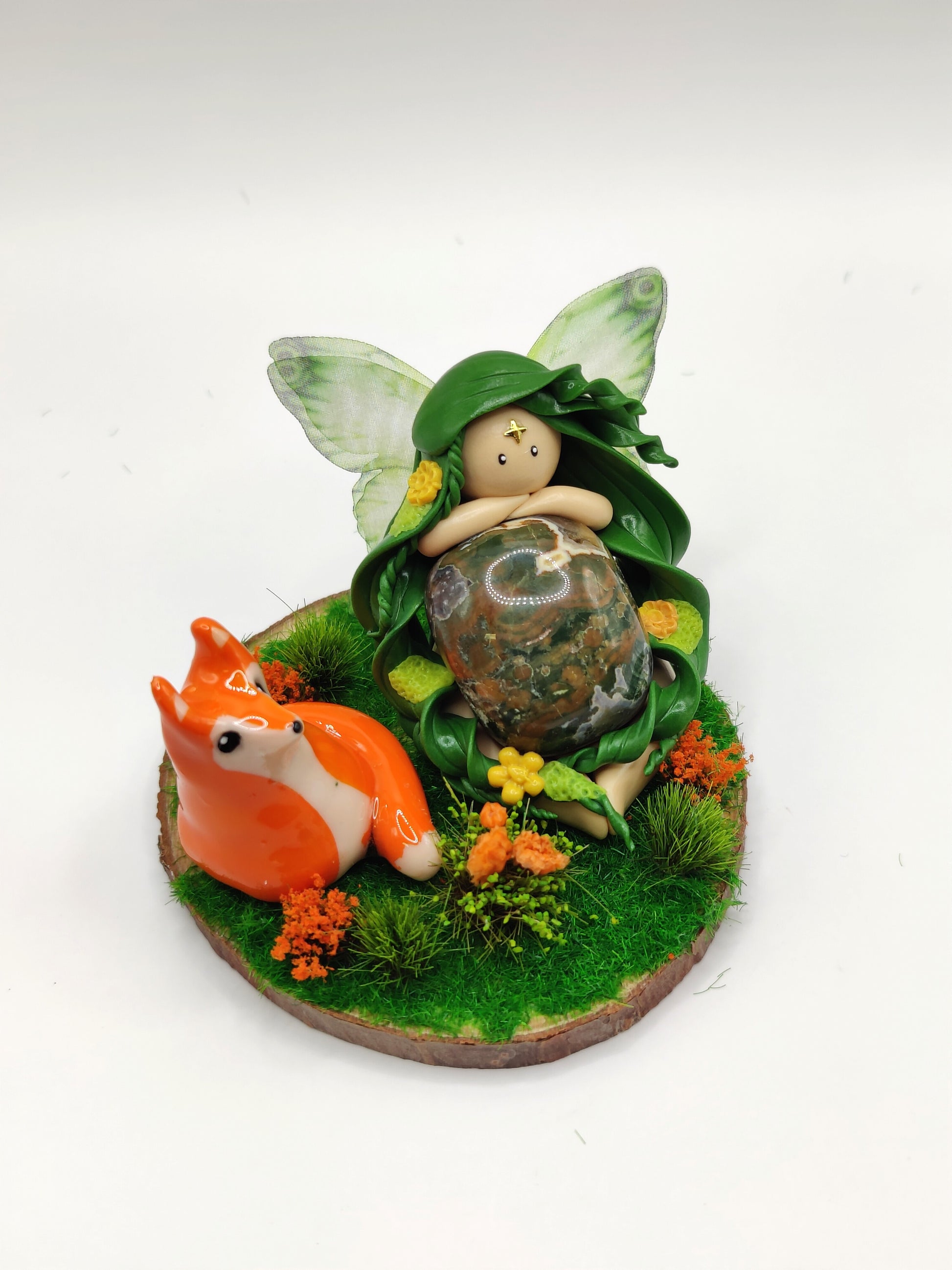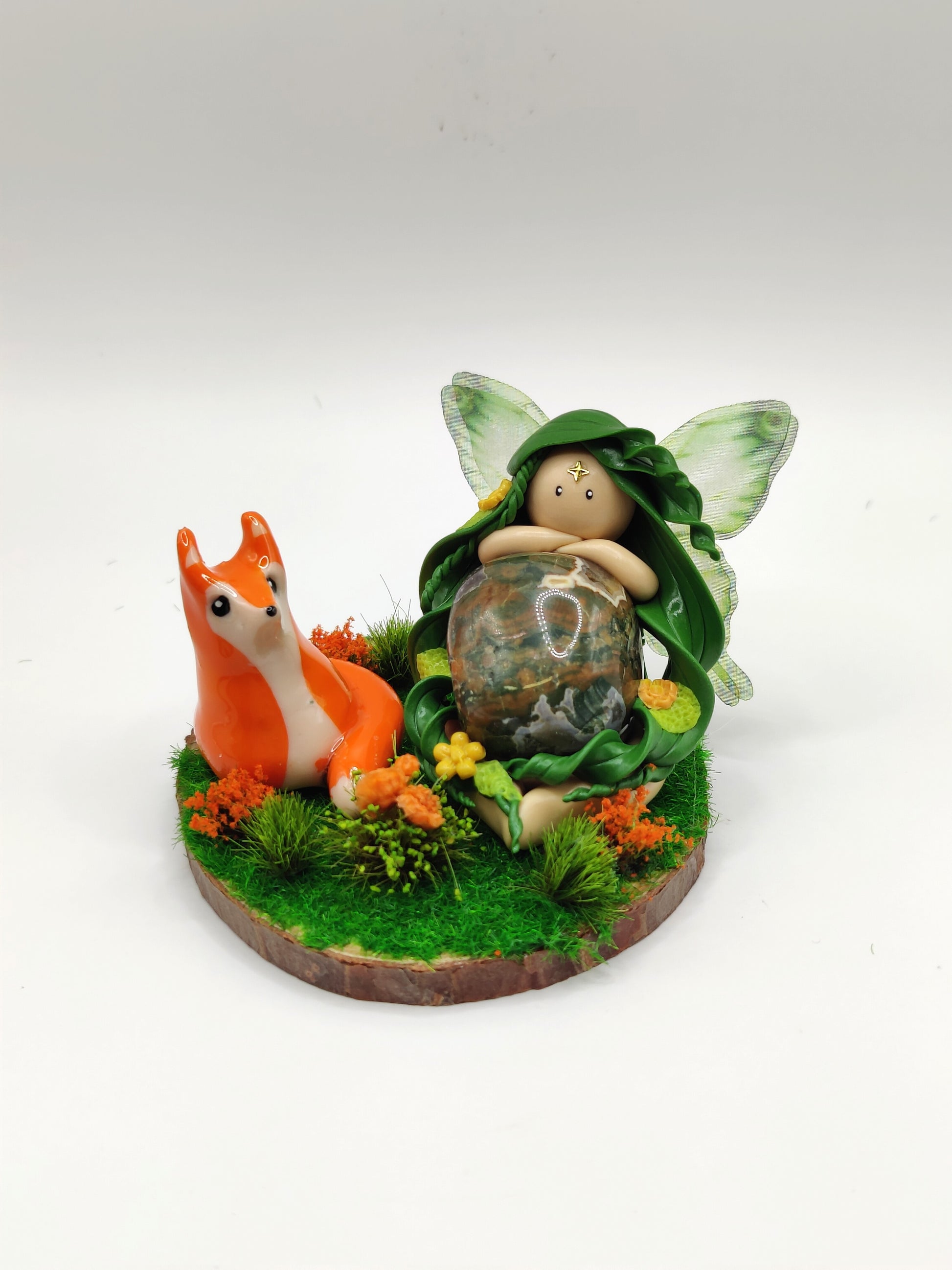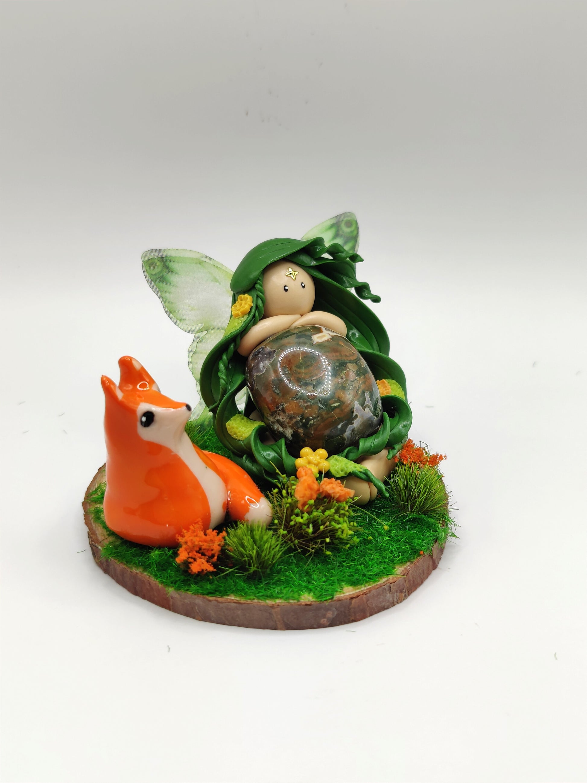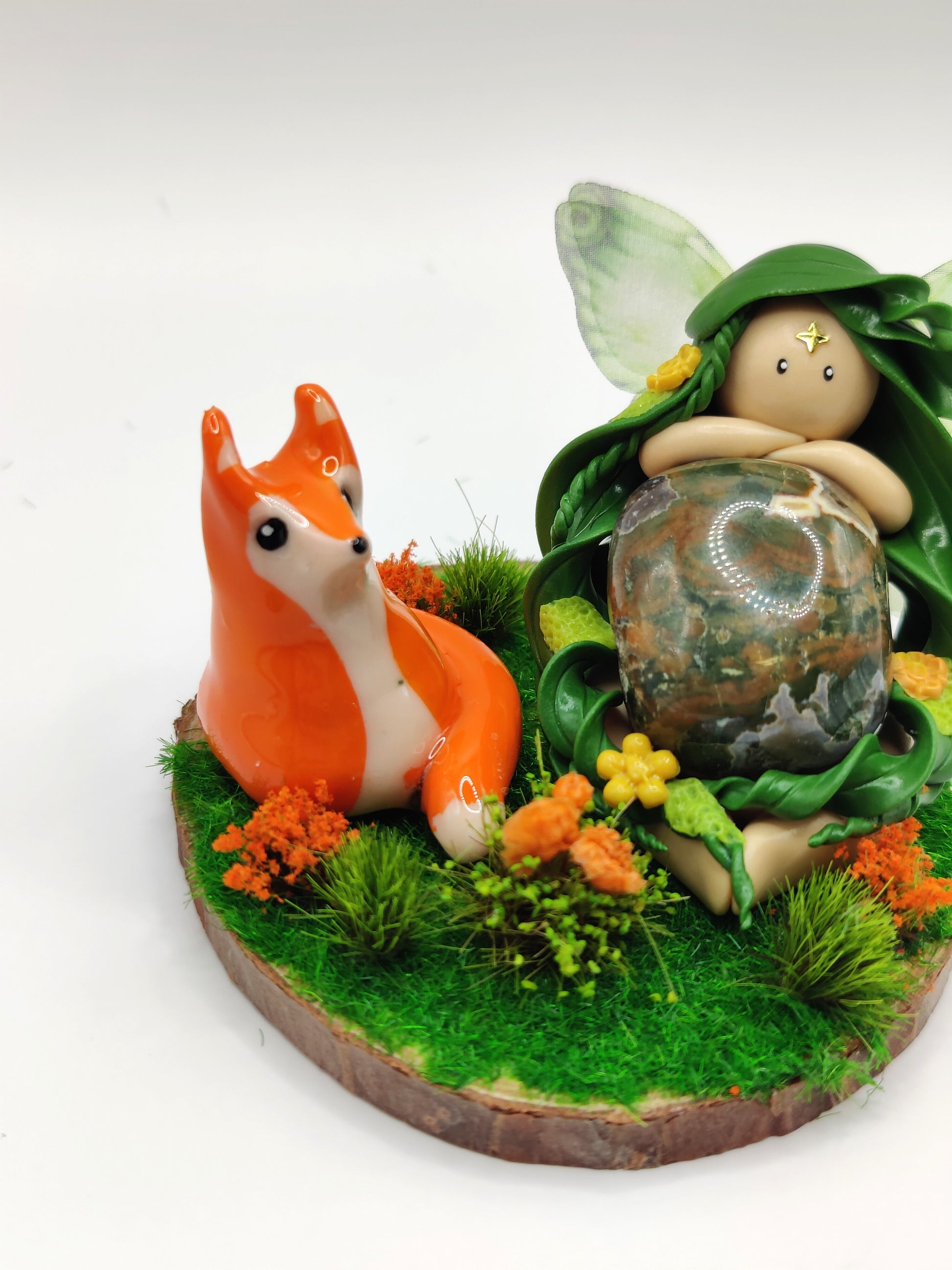 Jolie fée des animaux et son renard, avec sa belle rhyolite.