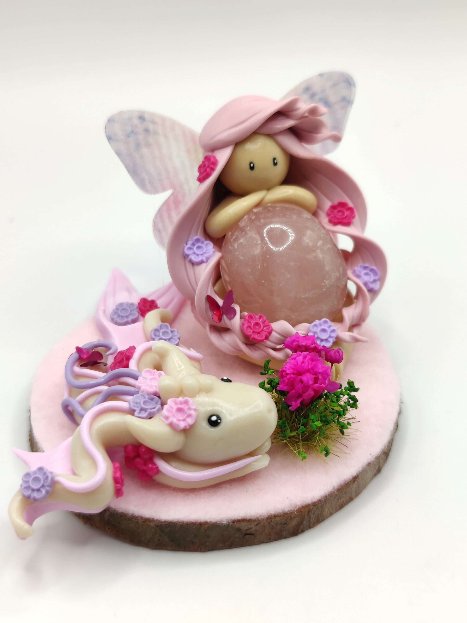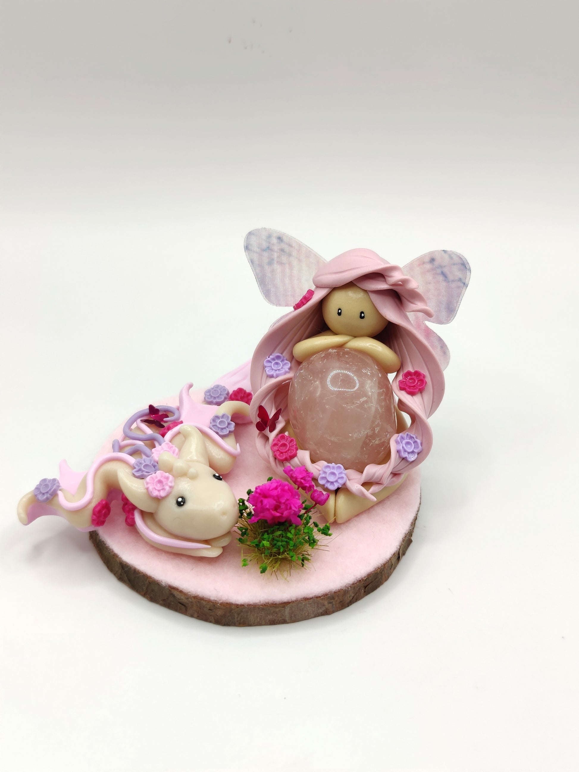 Jolie fée dragonnière et son dragon des fleurs, avec son joli quartz rose.