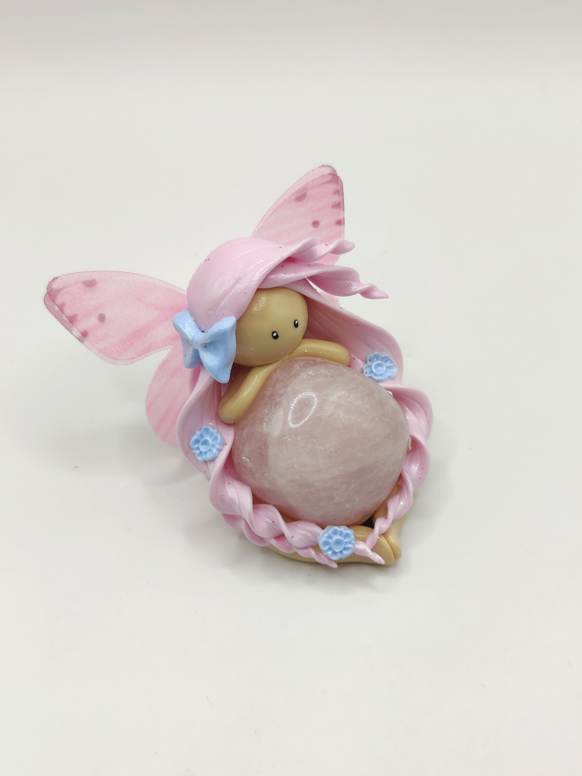Jolie petite fée rose et son quartz rose, au caractère doux et rieur.