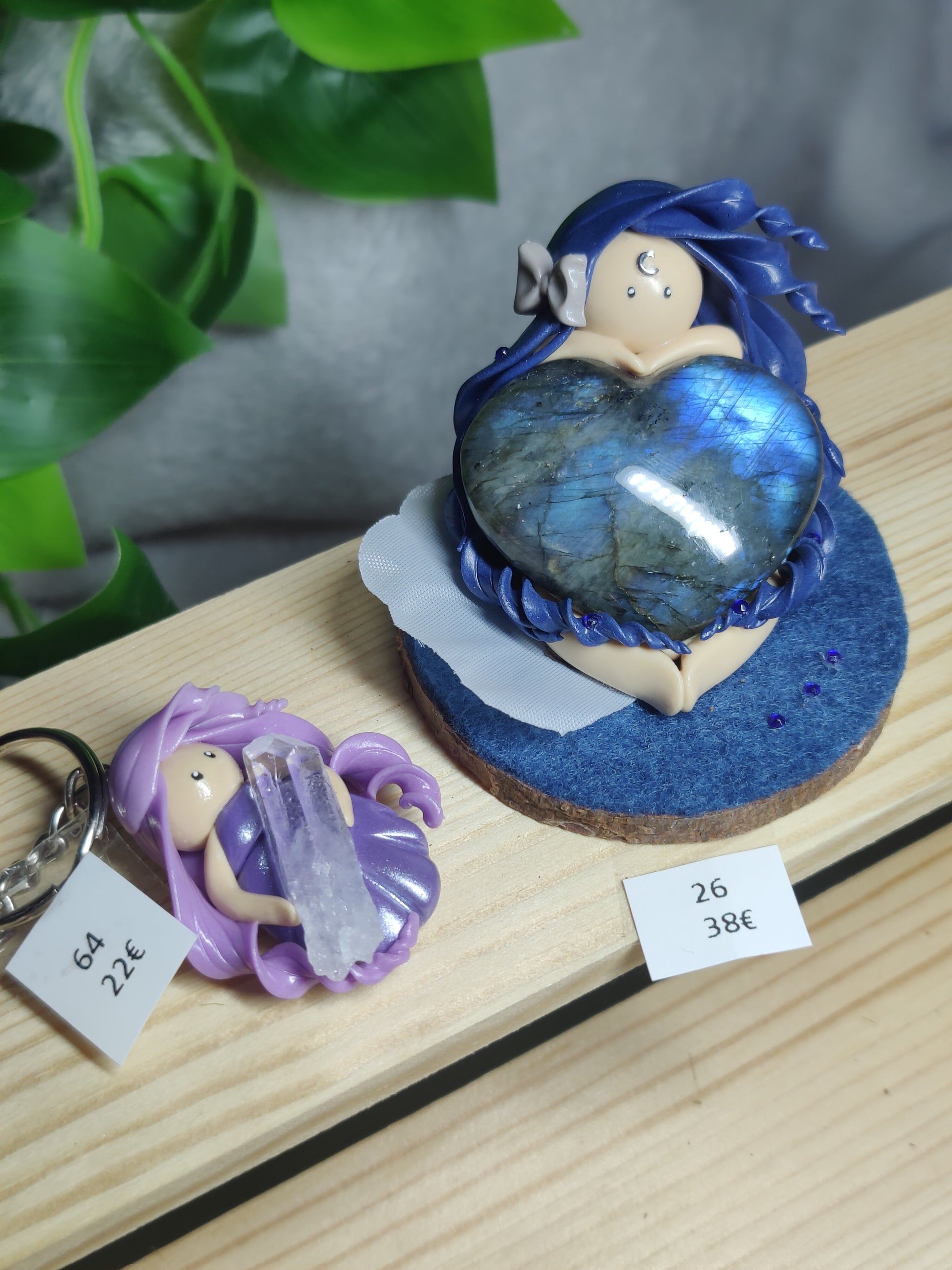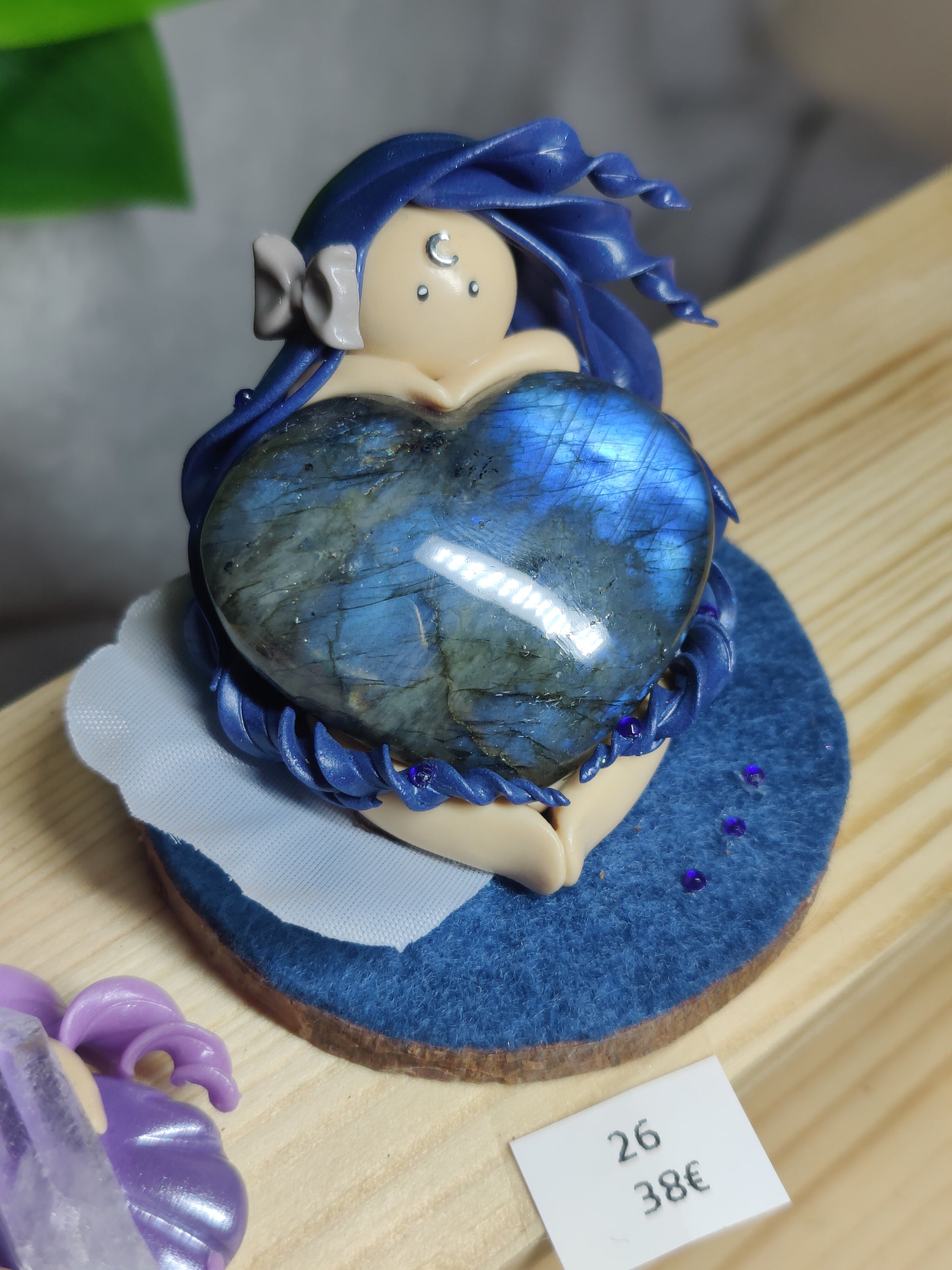 26 : Nymphe protectrice, labradorite en forme de cœur. Une linotte protectrice et bienveillante.