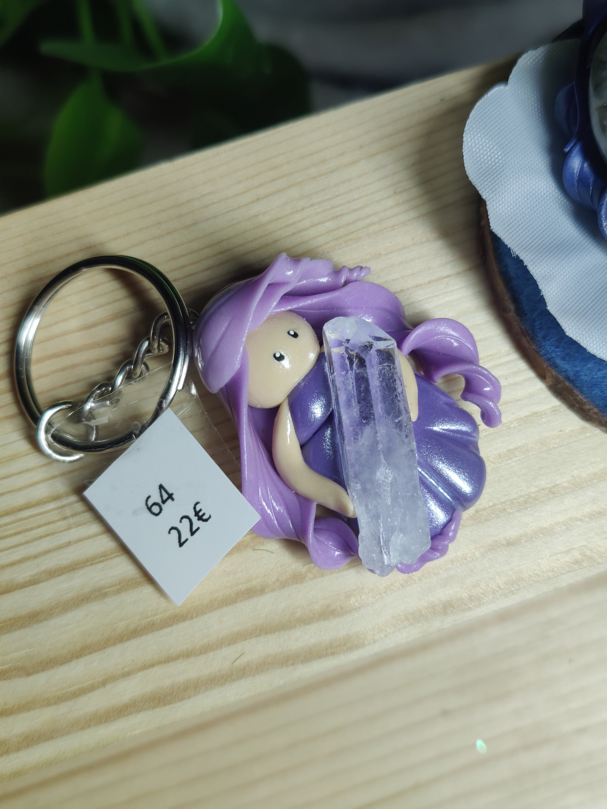64 : Porte clef mini linotte - Pointe de cristal de roche. Une petite linotte bienveillante et rieuse.