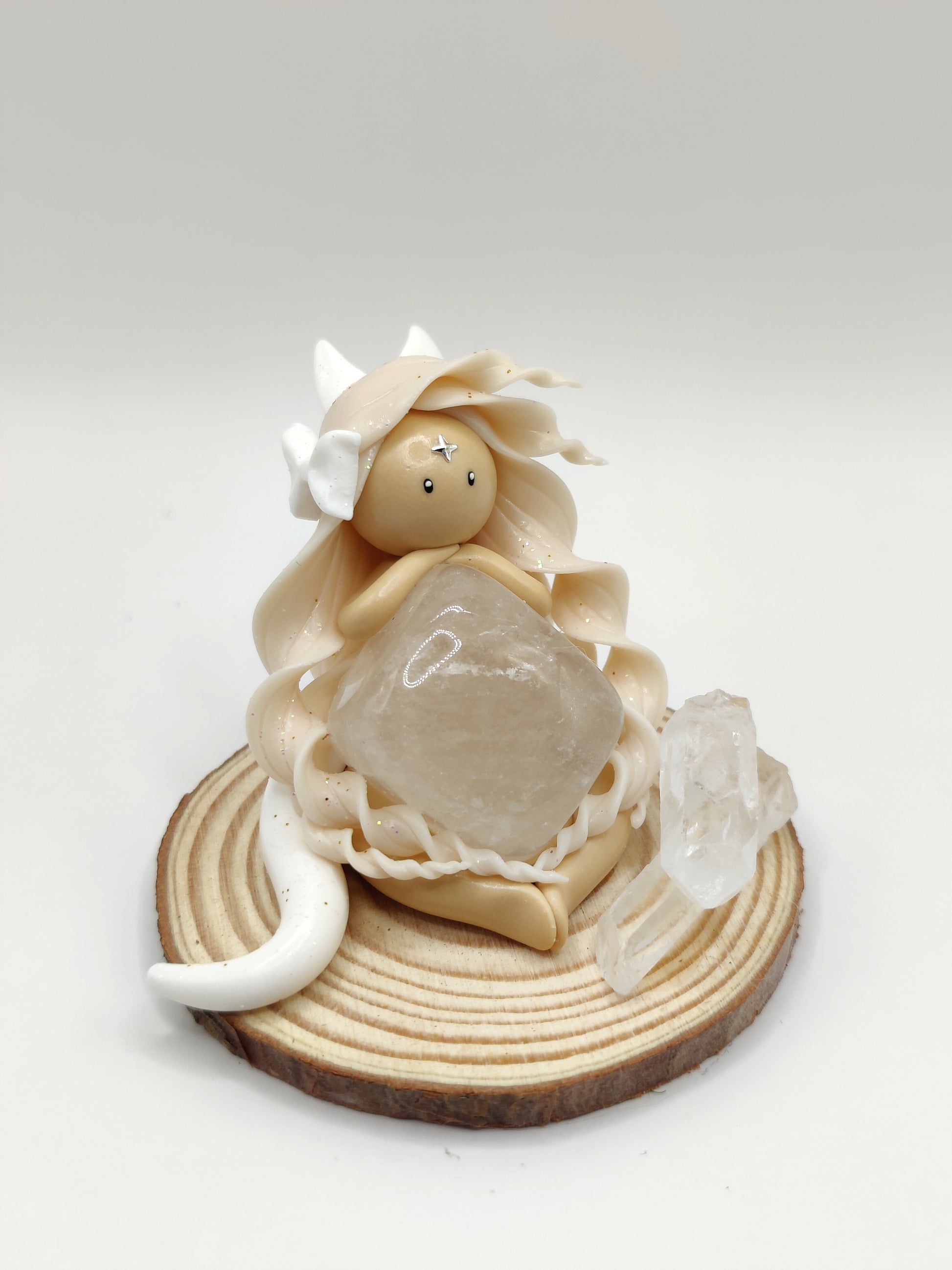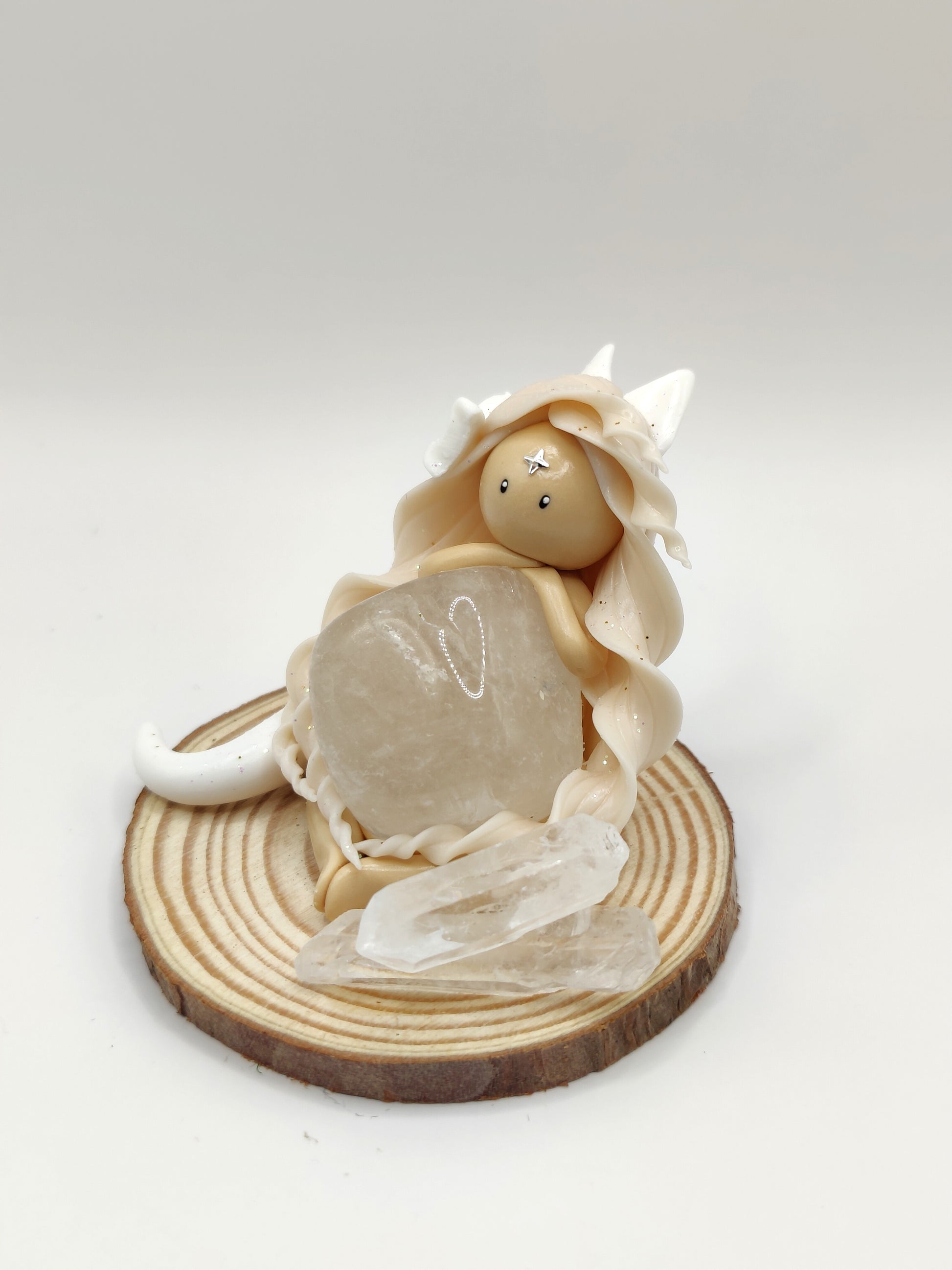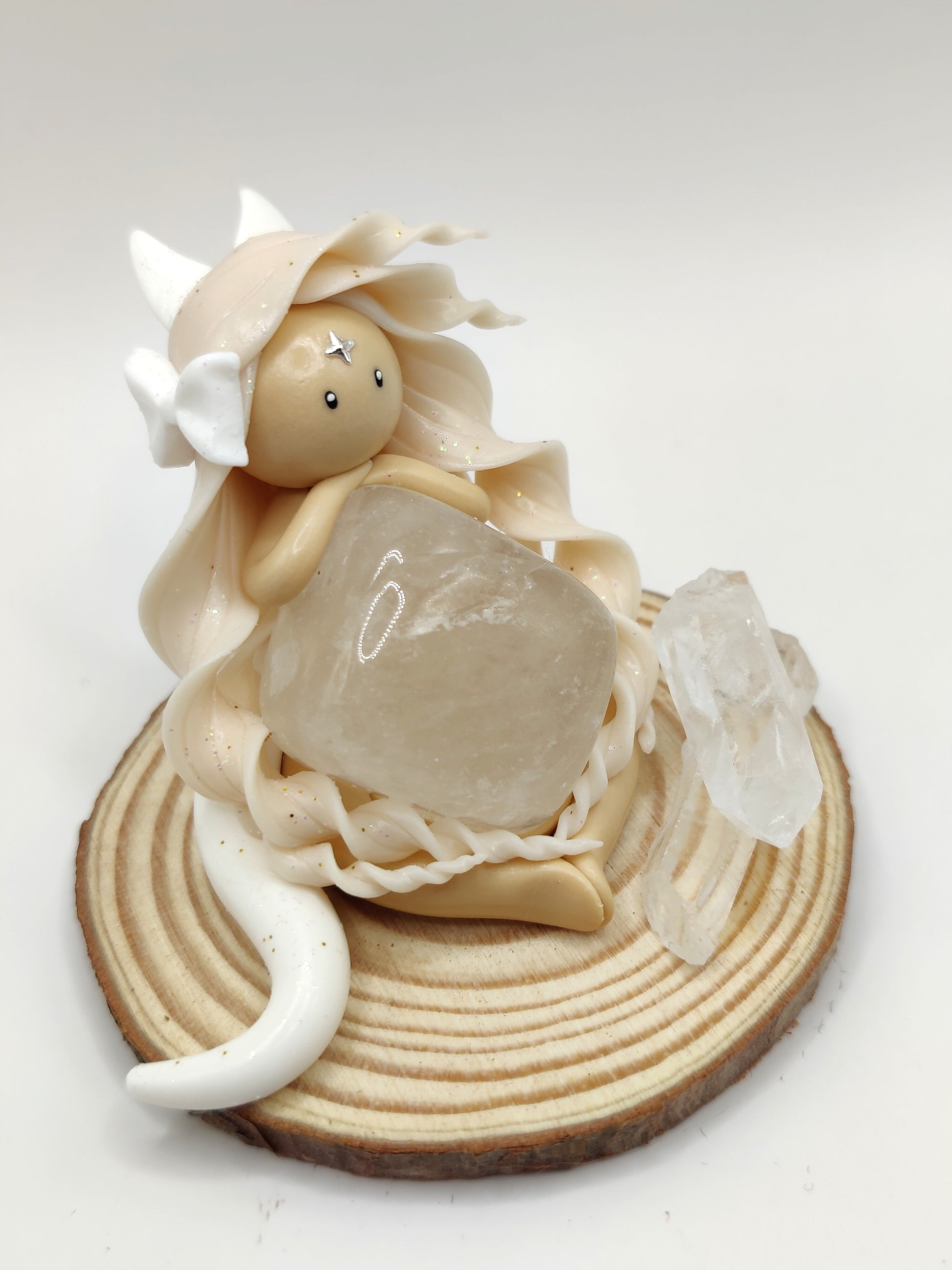 Jolie renarde polaire et sa jade blanche, avec des pointes de cristaux de roche.
