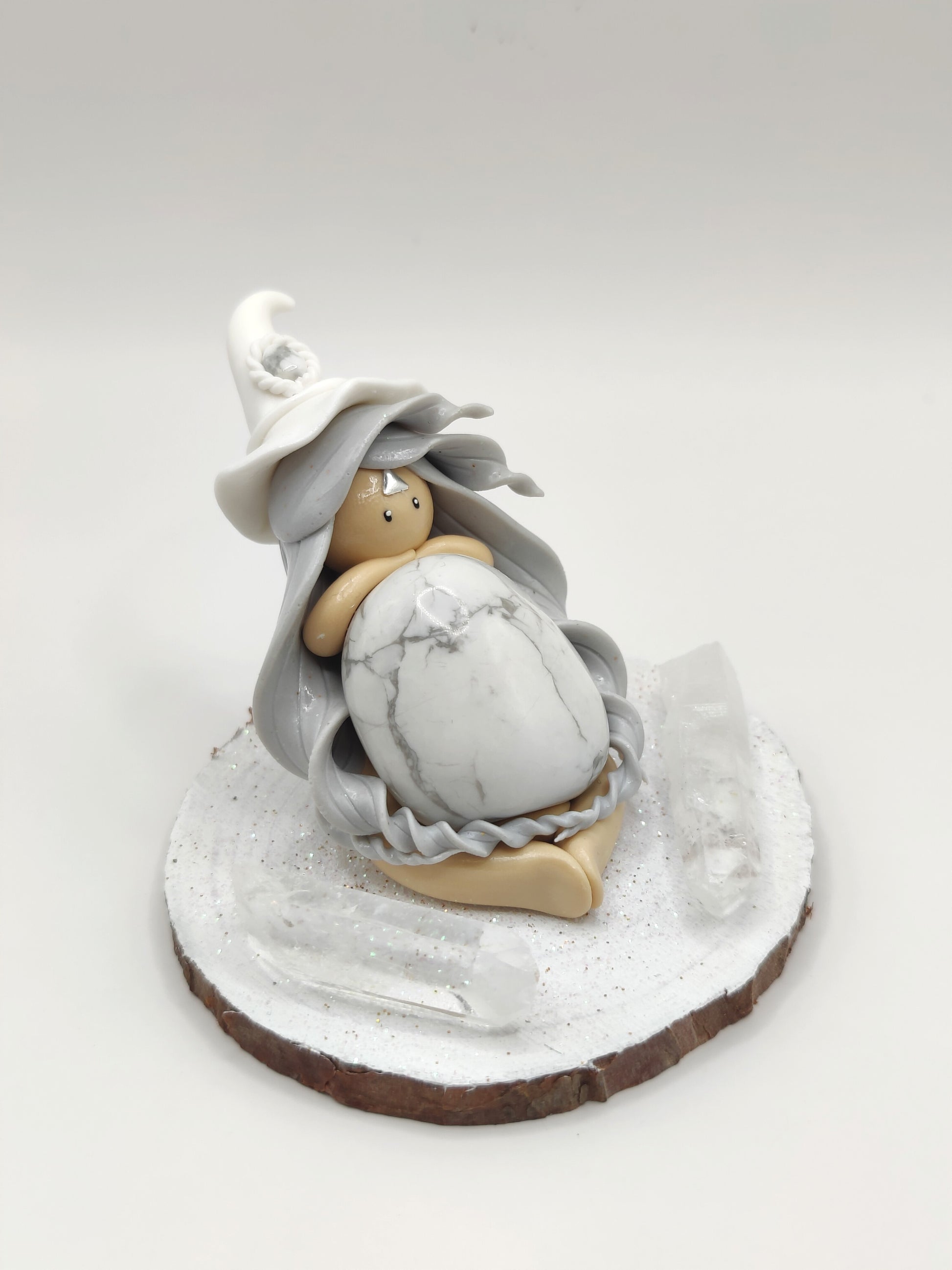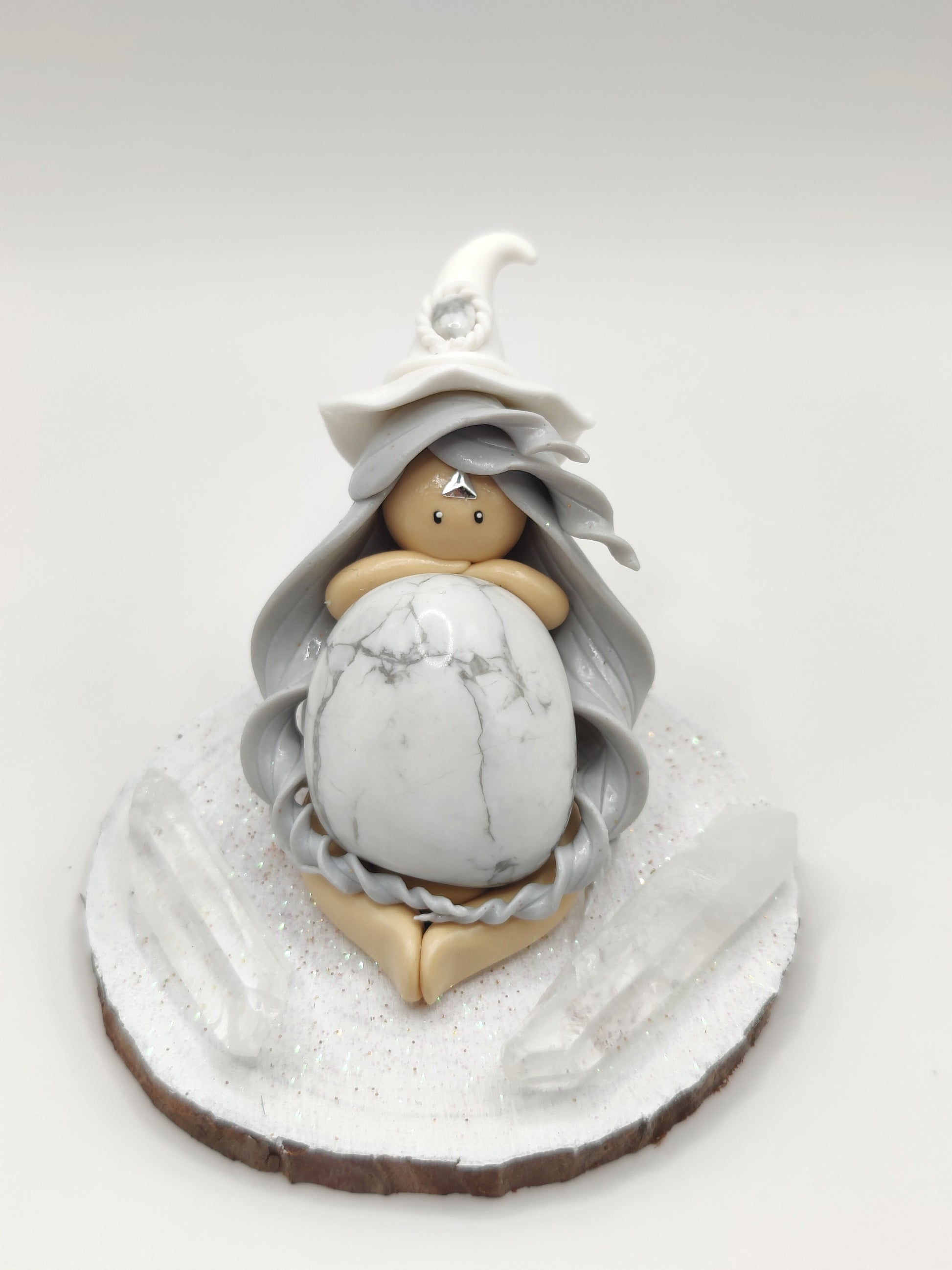 Jolie sorcière blanche et sa belle howlite. Elle est entouré de pointe de cristal de roche.