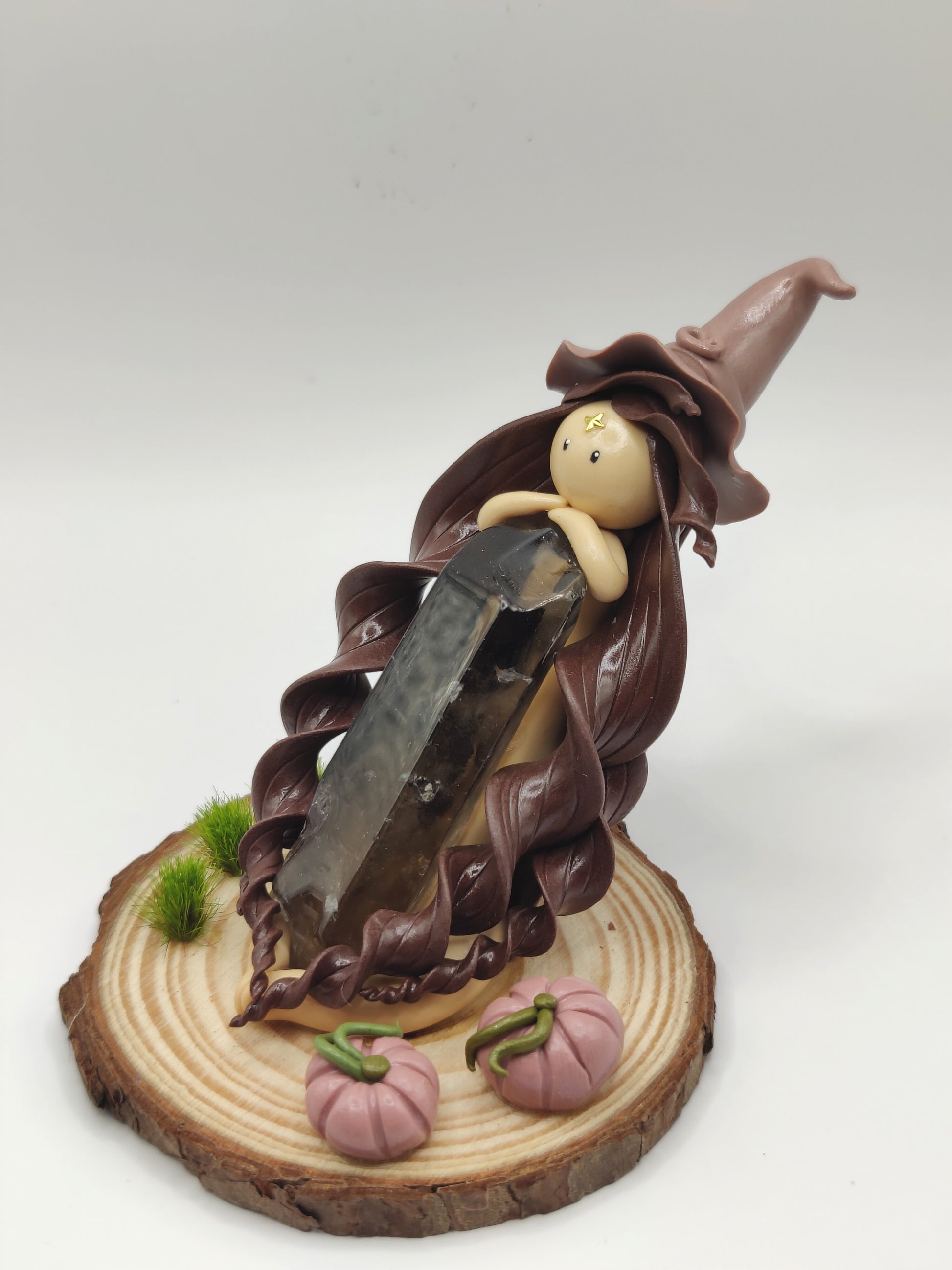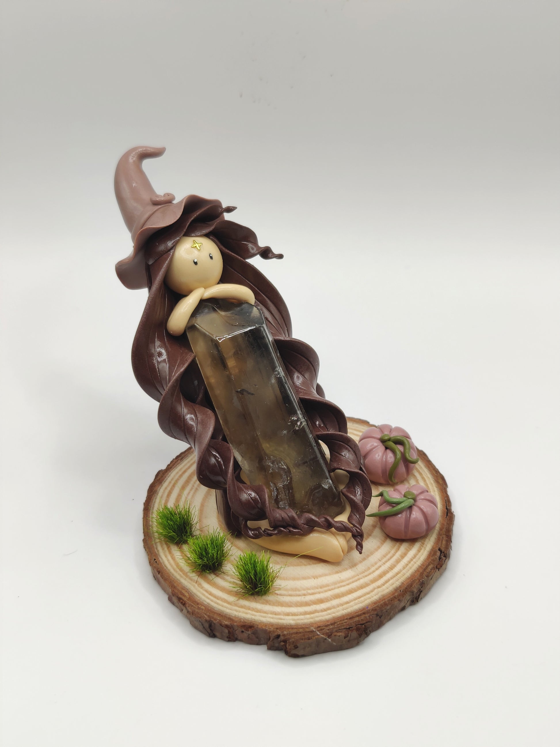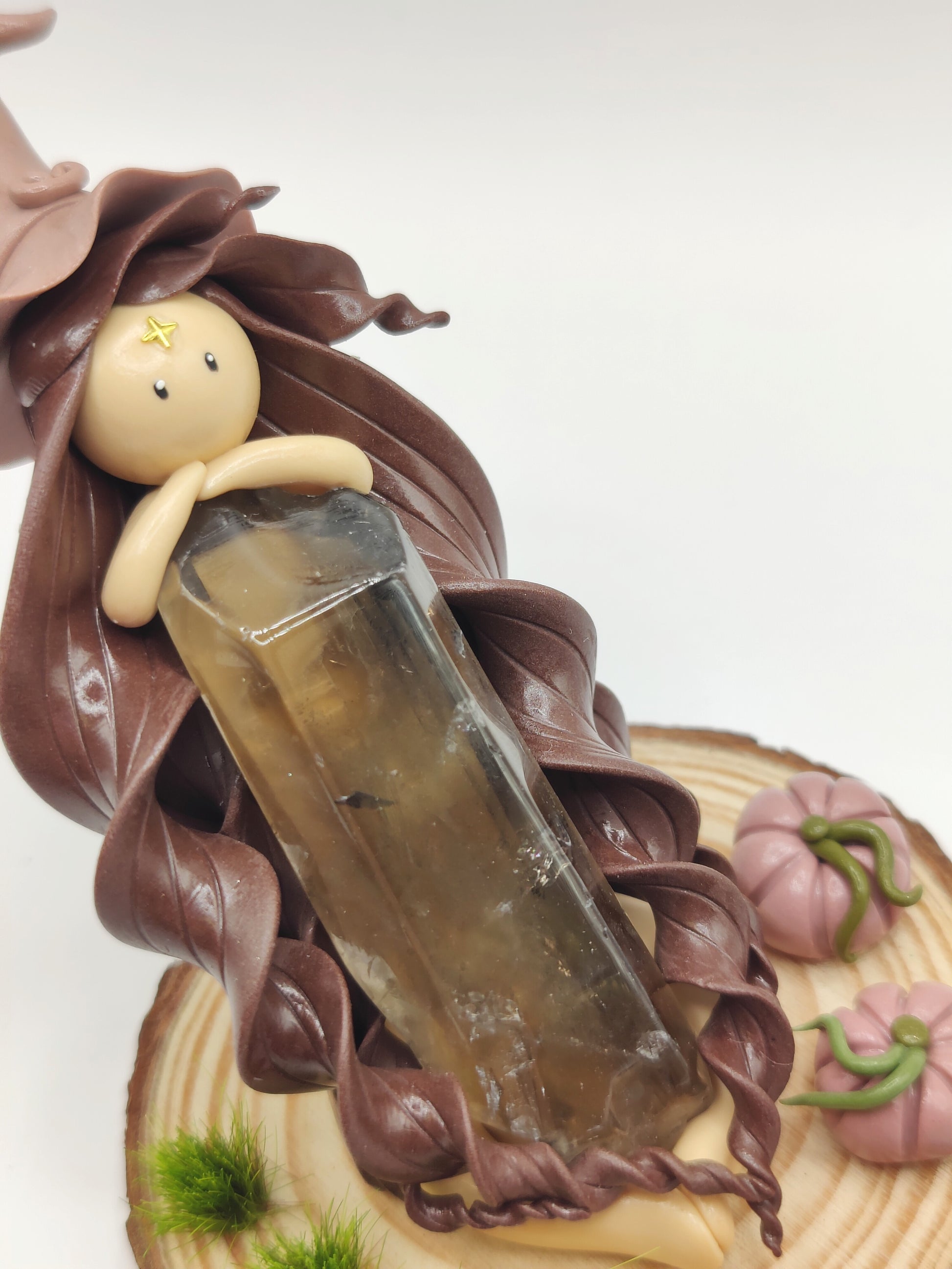 Jolie sorcière de l'automne et sa belle pointe de cristal de roche fumé.